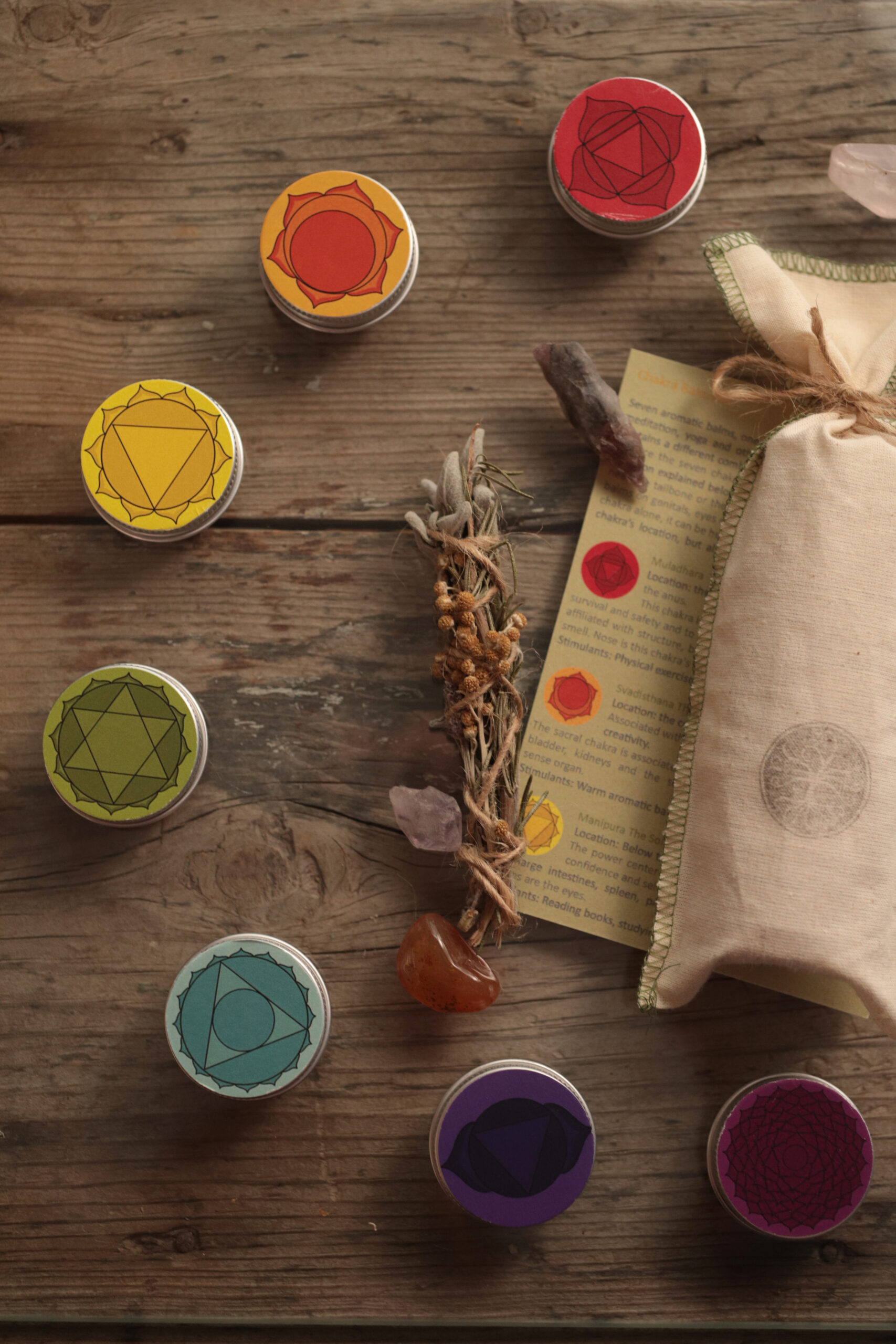 The set comes in a handmade fabric pouch with a guide to each chakra and instructions for mindful use and decorated with a tiny sage bundle, making it a beautiful and thoughtful gift for yourself or a loved one.