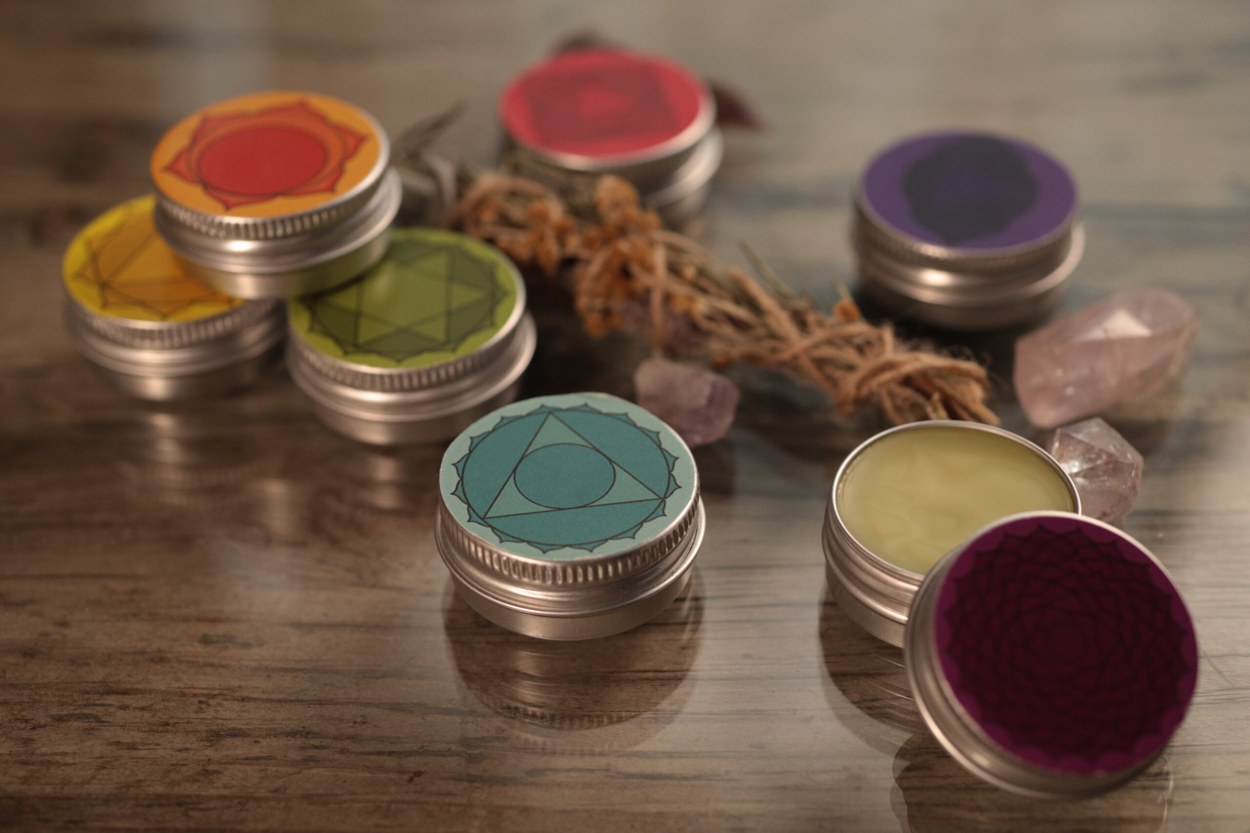 Seven aromatic balms, one for each of the main energy centers, to be used during meditation, yoga and other spiritual or meditative practises. Each balm contains a different combination of essential oils that help to stimulate and balance the seven chakras.